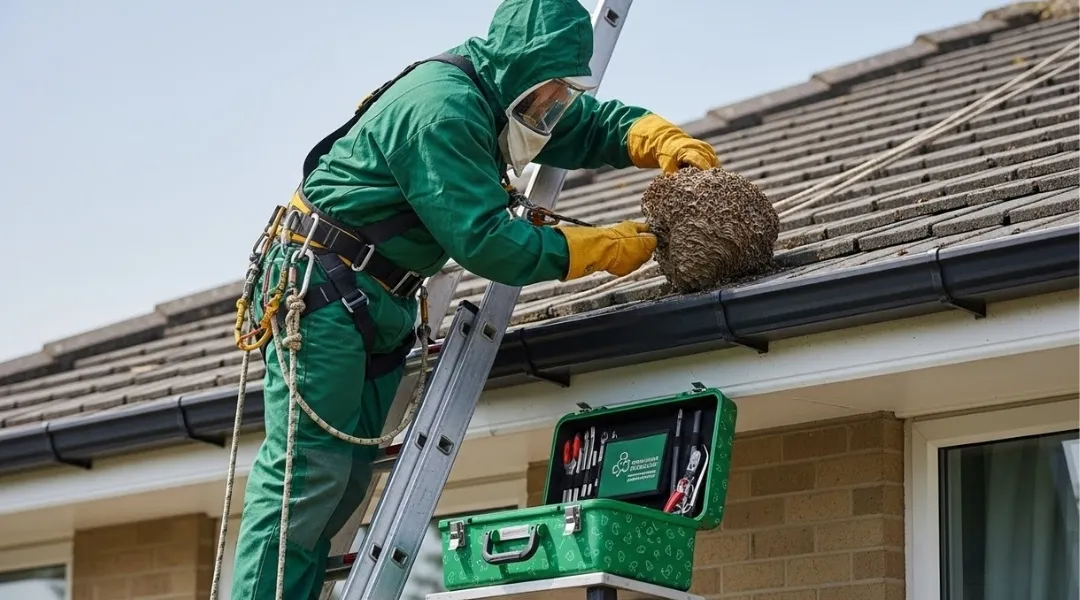 Wasp nest removal from Al Nuaimiya residential façades, shop signboards, and rooftop service areas.